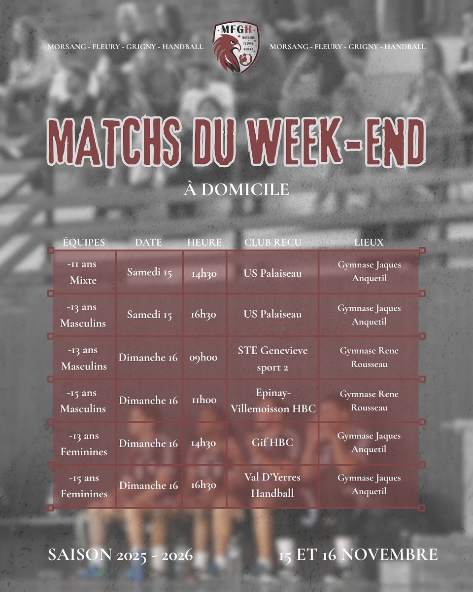 Beaucoup de nos équipes jouent à domicile ce week-end, attention aux changements de gymnase entre les matchs !