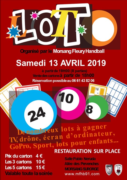 Bonjour à tous, Le loto est de retour le samedi 13 avril 2019 à la salle Pablo Neruda. Vente des cartons à partir de 18h. De nombreux lots à gagner: Smartbox, bons d'achat, jeux pour enfants, écran d'ordinateur, télévision... Restauration sur place. Réservation sur karine.belage@mfhb91.com Nous vous attendons nombreux.