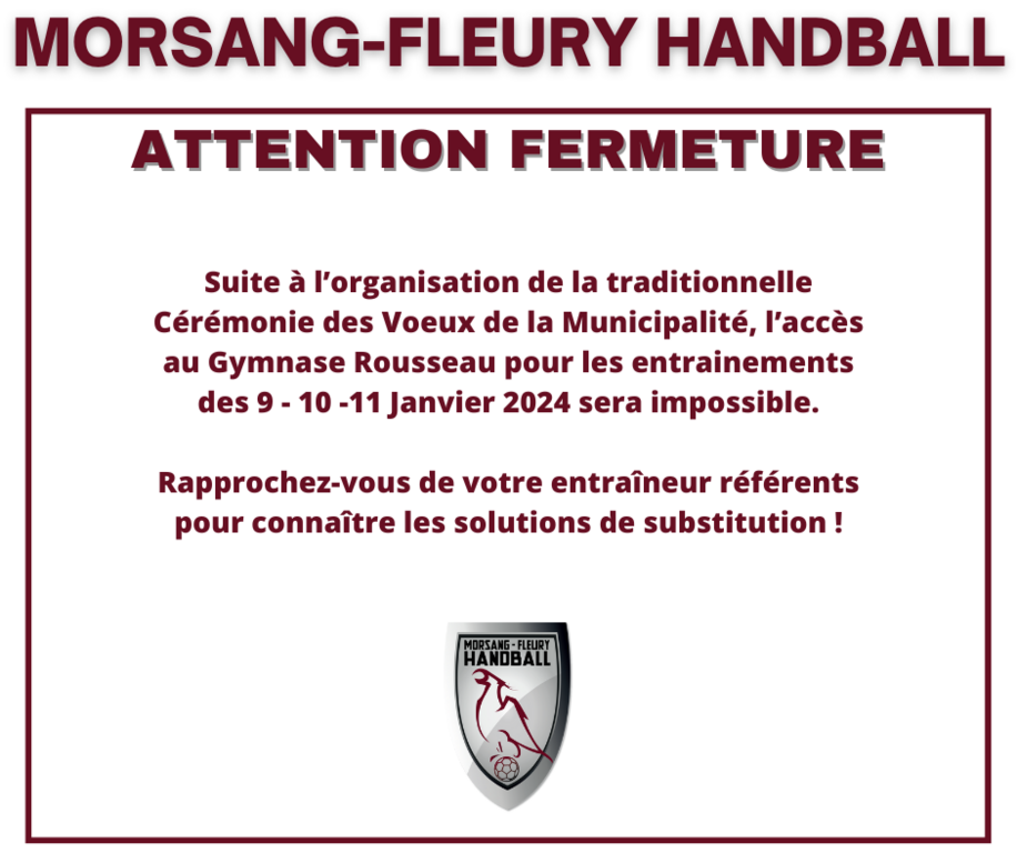 Suite à l’organisation de la traditionnelle Cérémonie des Voeux de la Municipalité, l’accès au Gymnase Rousseau pour les entrainements des 9 - 10 -11 Janvier 2024 sera impossible.