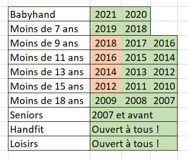 - Les deux années de naissance "traditionnelles" d'une catégorie sont celles surlignées en vert et sont les repères pour savoir dans quelle catégorie jouer pour vous ou votre enfant.