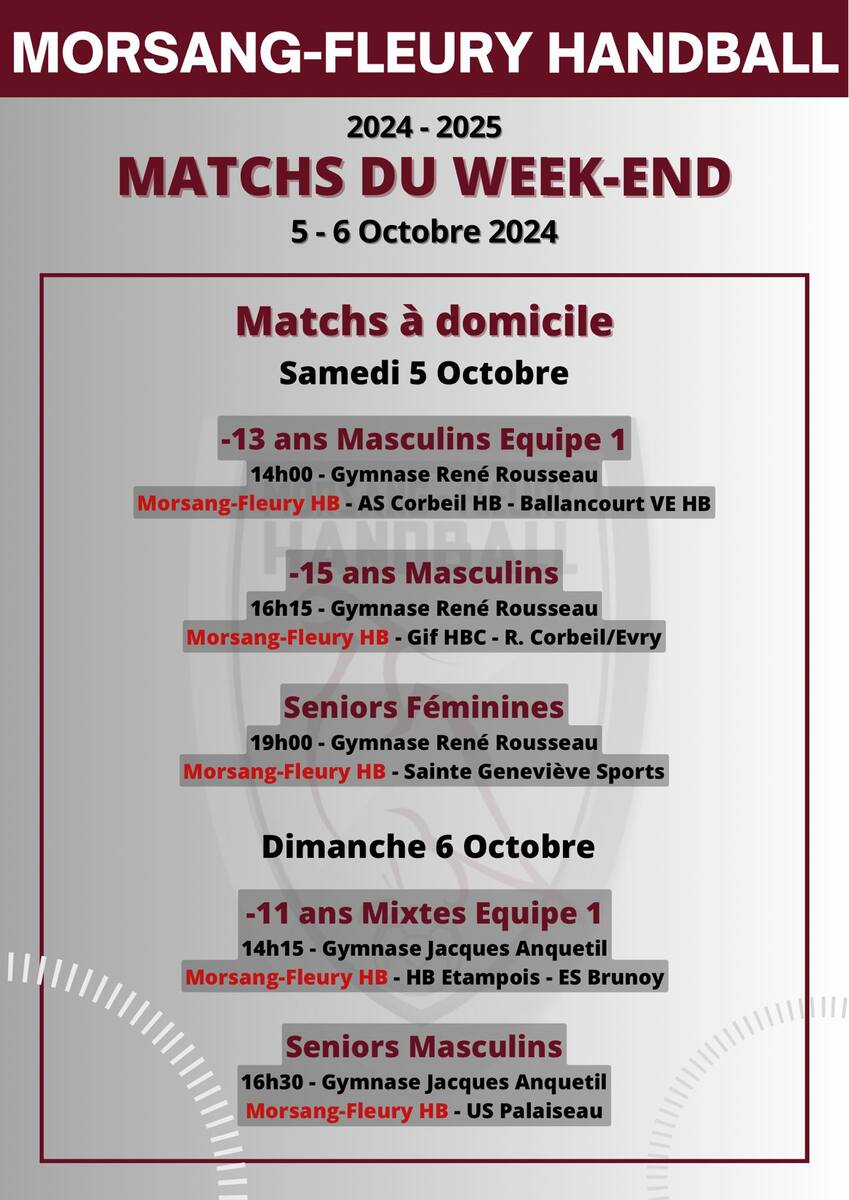 Dimanche les -11 ans joueront à 14h00 au gymnase Anquetil tandis que les Seniors Masculins débuteront leur rencontre à 16h30 !